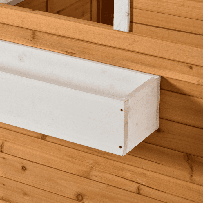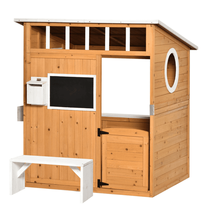 The outdoor play house is made of natural fir wood, which is safe for kids to play in. In addition, this backyard play house comes with a water-resistant surface, making it an ideal choice for placing outside for a long time.