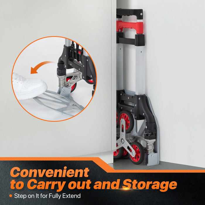 The bungee cord of this foldable hand truck feature provides additional security and support for the load being transported. It can be used to secure items in place, reducing the risk of damage or loss during transport. This can provide peace of mind when moving valuable or fragile items.