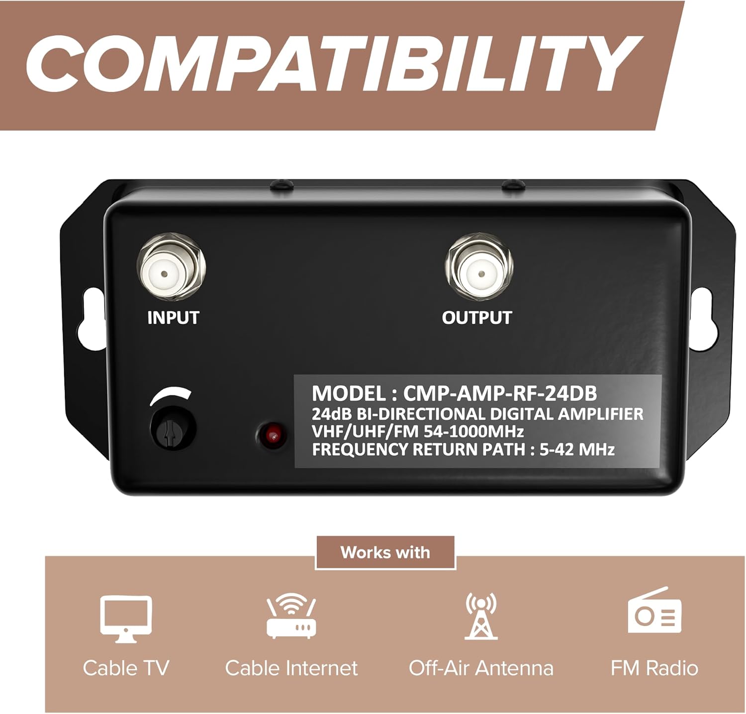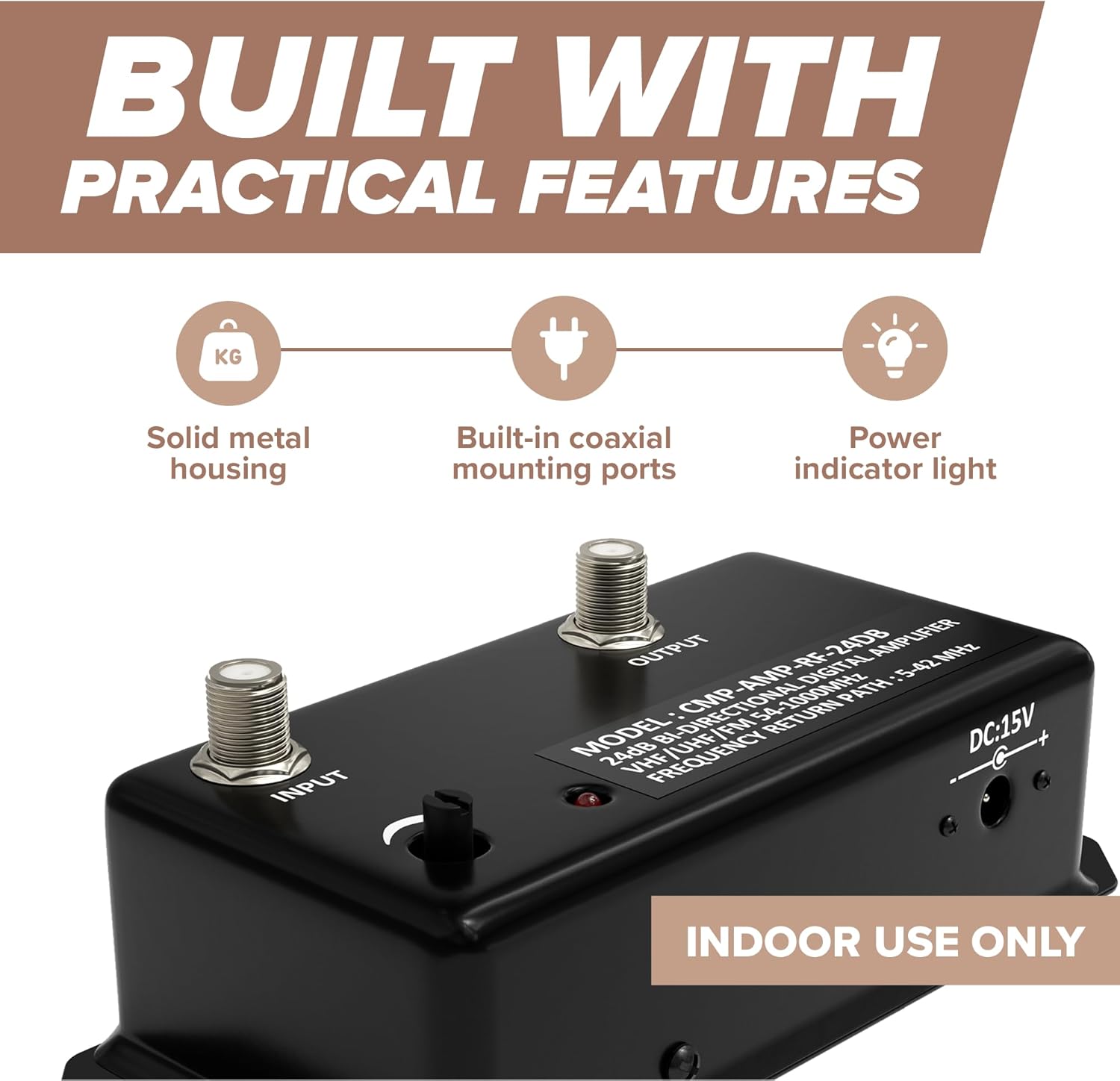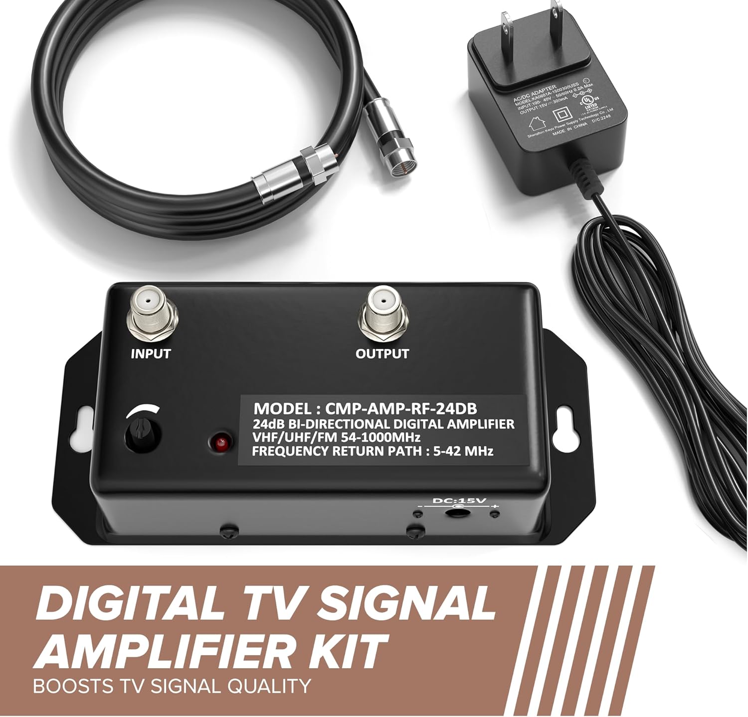 Digital TV Antenna Amplifier Kit – Adjustable 24dB Signal Booster with RG6 Coaxial Cable, Supports NTSC/ATSC/FM/UHF/VHF up to 1000 MHz – Indoor Use