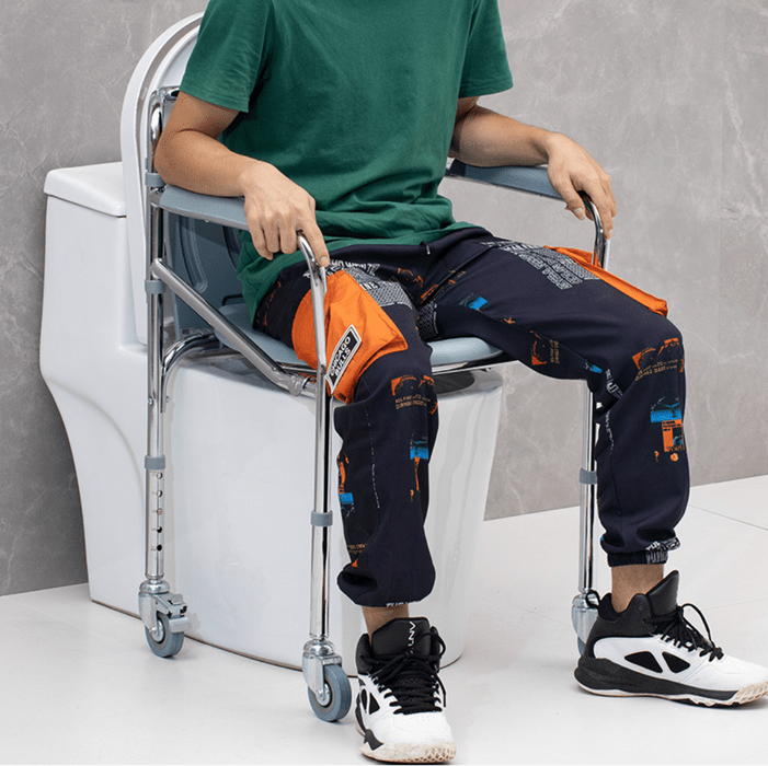 Designed specifically as a handicap shower chair, this toilet's higher seat allows them to go to the toilet safely and conveniently. This product can be used both as a bedside toilet and as a rolling shower chair for caregivers to use to shower an elderly relative!