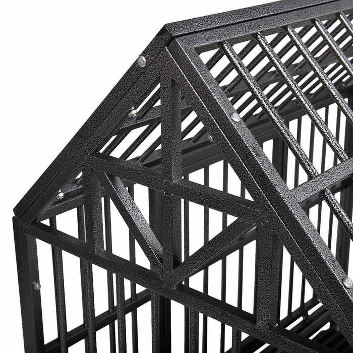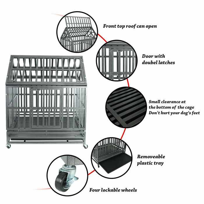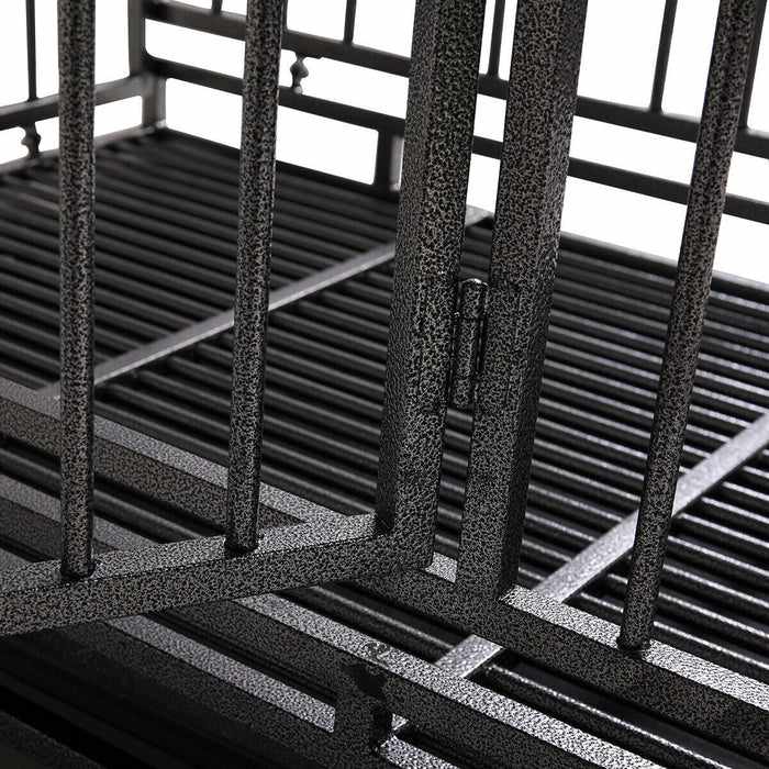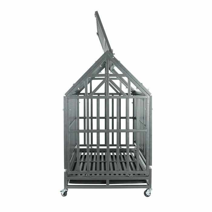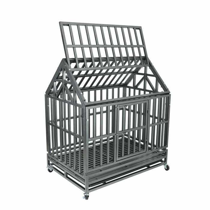This extra-large dog crate features a removable tray for easy cleaning, as well as wheels that make transporting it simple. Moreover, this large dog cage is collapsible to save space when not in use.