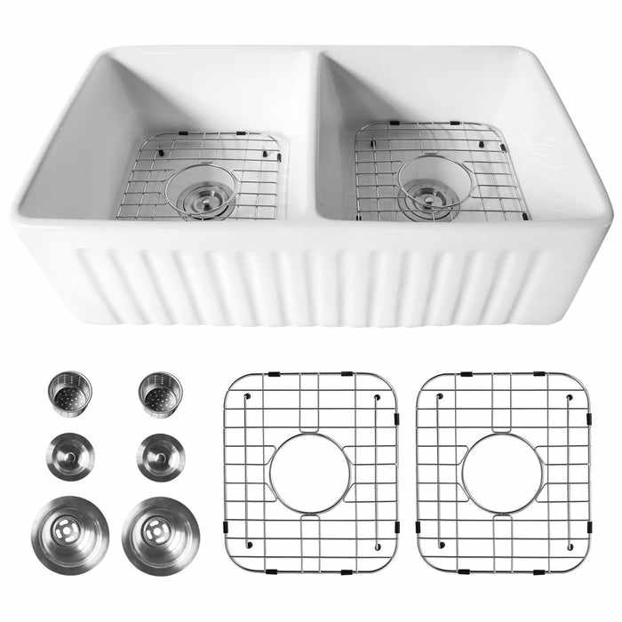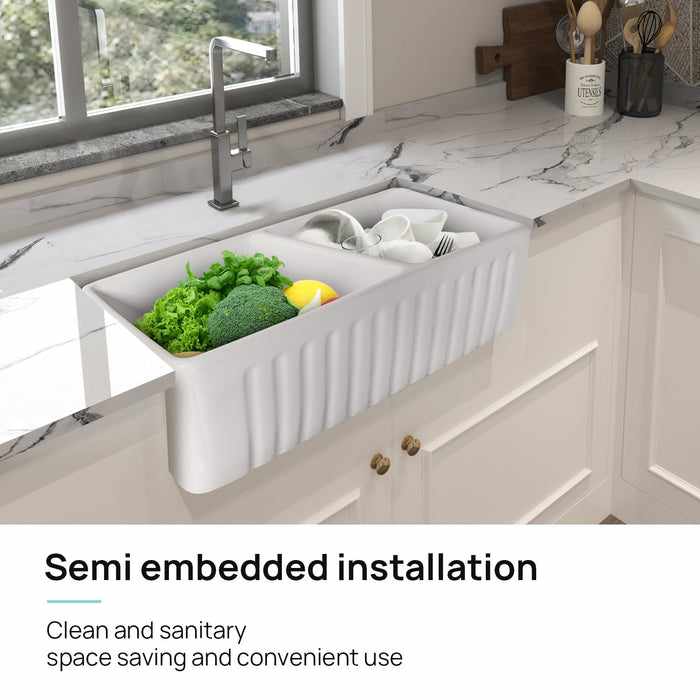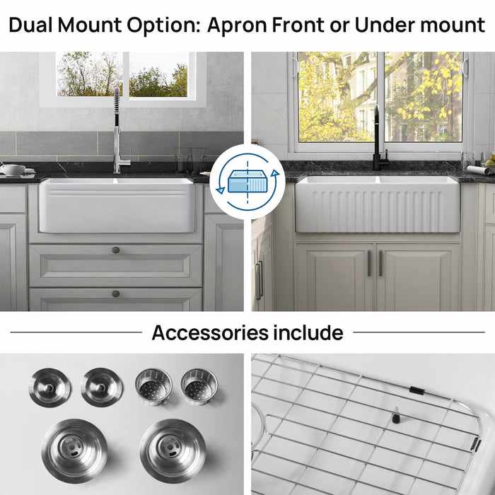 Overall, our 33-inch undermount farmhouse sink is a versatile and practical addition to any kitchen. Its durable construction, classic white finish, and double bowl design make it the perfect choice for those seeking both functionality and style in their kitchen sink. With its undermount installation, it provides a seamless and polished look, adding value to your kitchen.