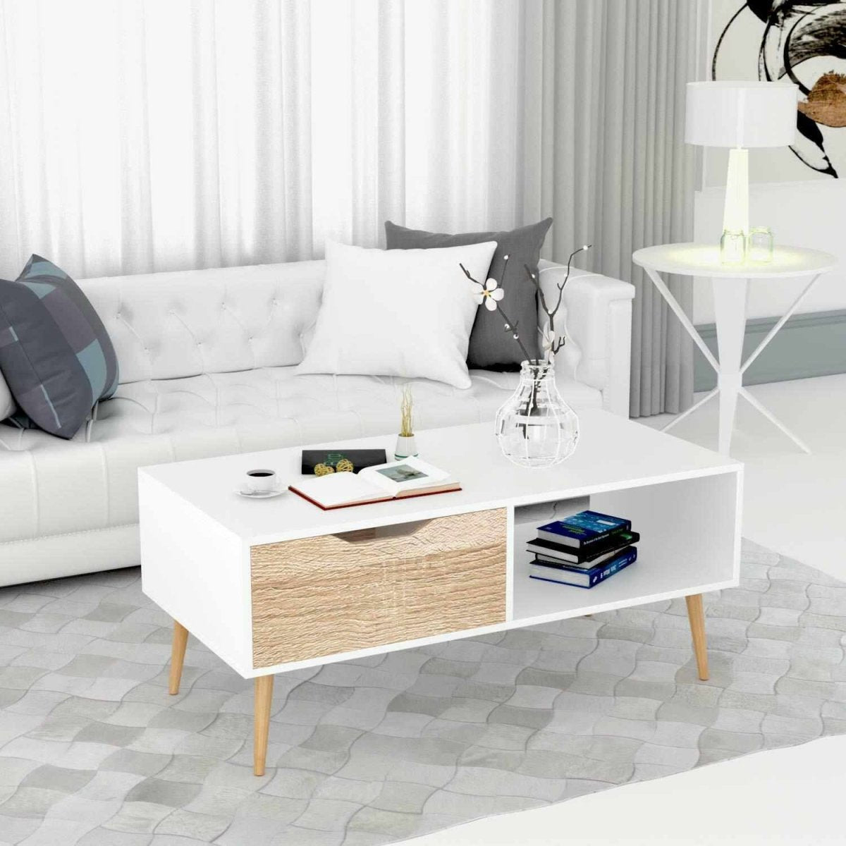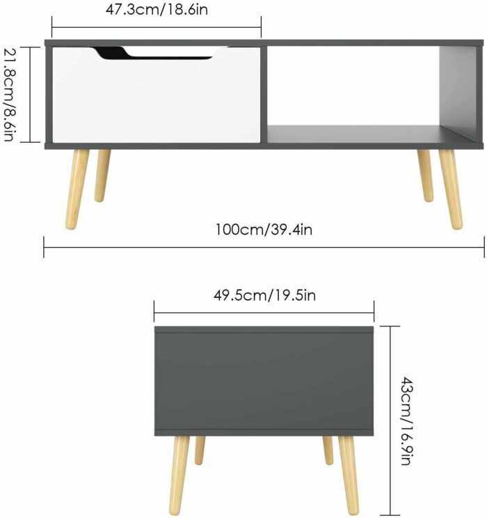 Modern design – White table top and brown drawer with 4 legs gives the coffee table its charm. Elegant appearance fits well with different decoration styles.