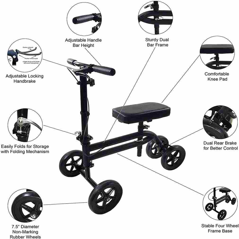 STABILITY AND CONTROL : These easy to maneuver steerable knee scooter walkers feature four 7.5" rubber wheels, Dual adjustable locking handbrakes and dual rear on-wheel brakes.
