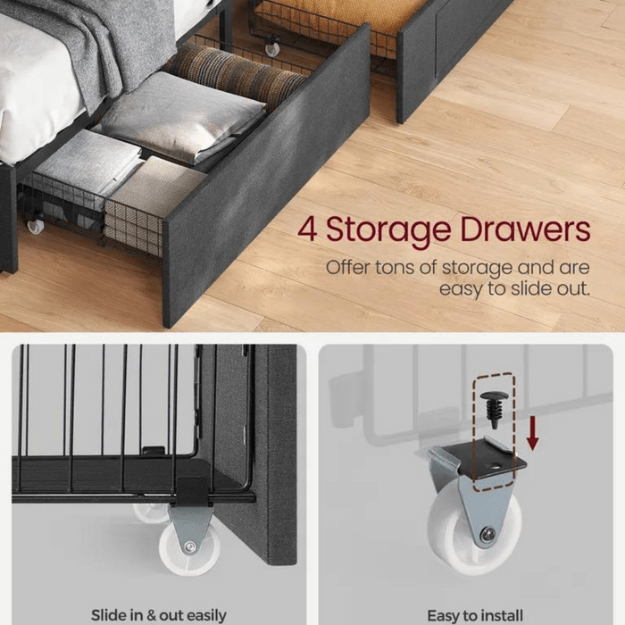 Crafted from high-quality materials, our queen bed frame with headboard is built to last, ensuring years of comfortable and restful sleep. The 4 drawers provide ample storage space for all your bedding and clothing, while the USB and Type C ports allow you to charge your devices conveniently.
