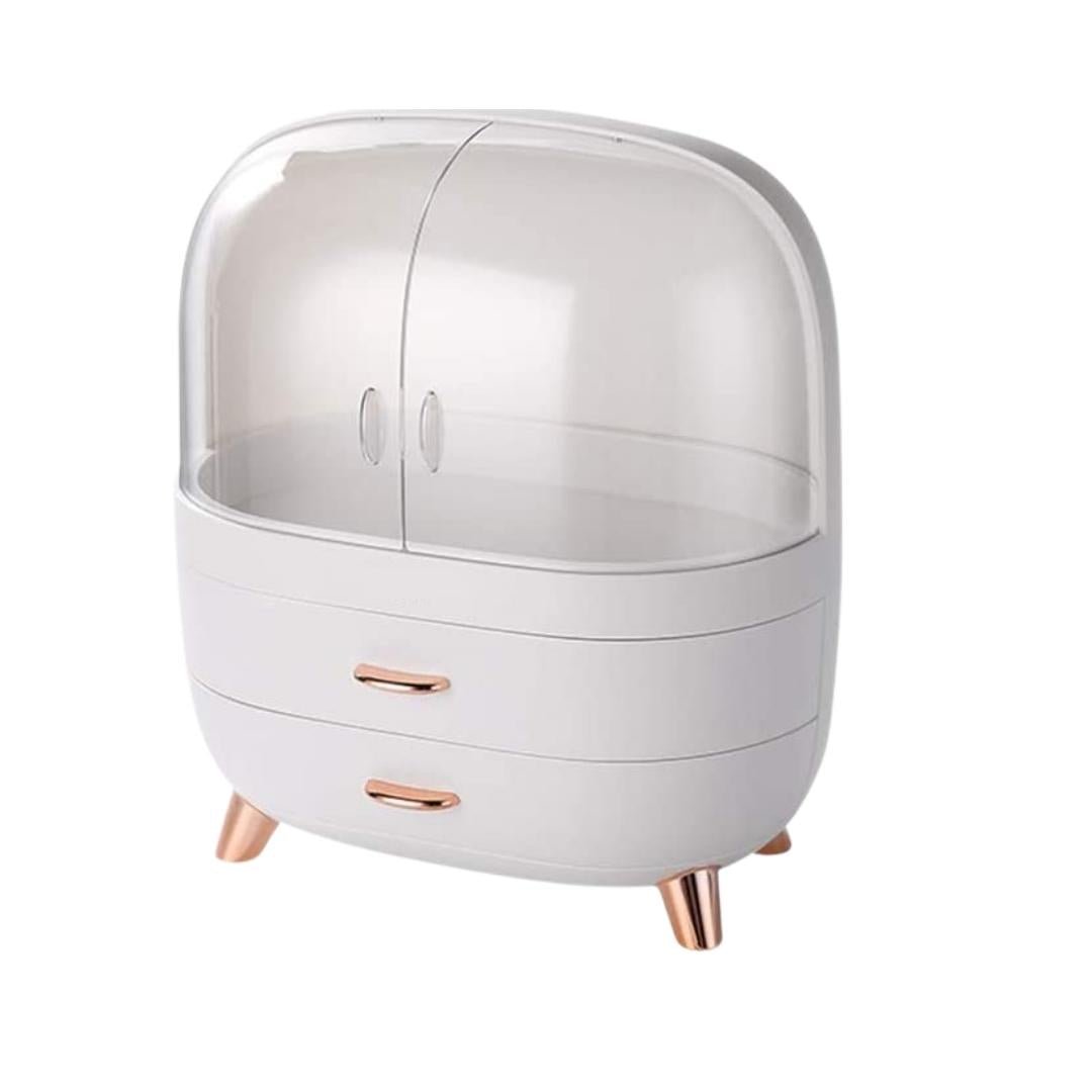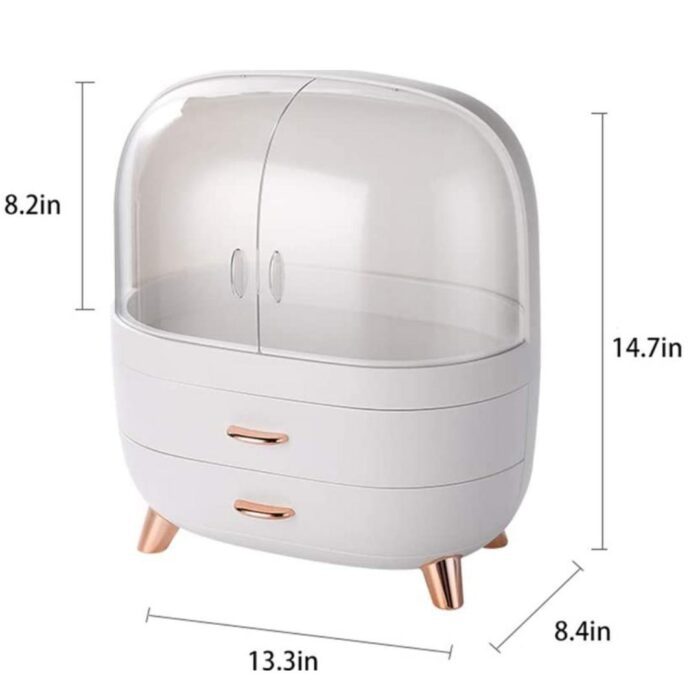 With this large capacity makeup storage organiser box, you can proudly display your beauty collection. This rounded stylish makeup box with clear acrylic lid is perfect for displaying your cosmetics. It’s large enough to hold makeup palettes, accessories, and other cosmetics, with a display shelf and two fully functional drawers. Your dressing table will be organized and glam in no time thanks to its unique design.