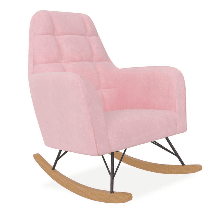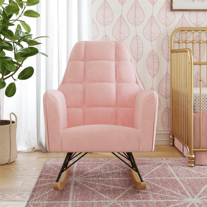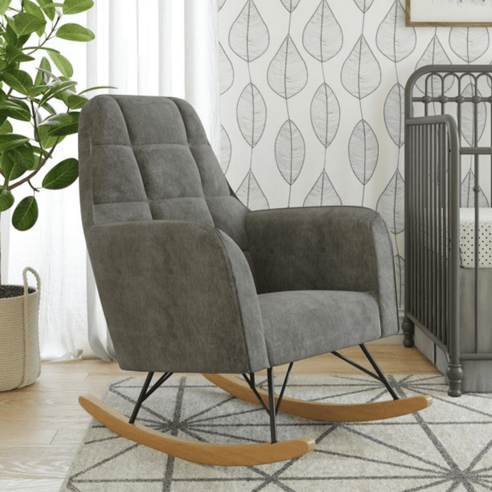 Decorative Furniture: This nursing rocker is a modern, mid-century looking piece. It has square tufted detailing on the backrest.