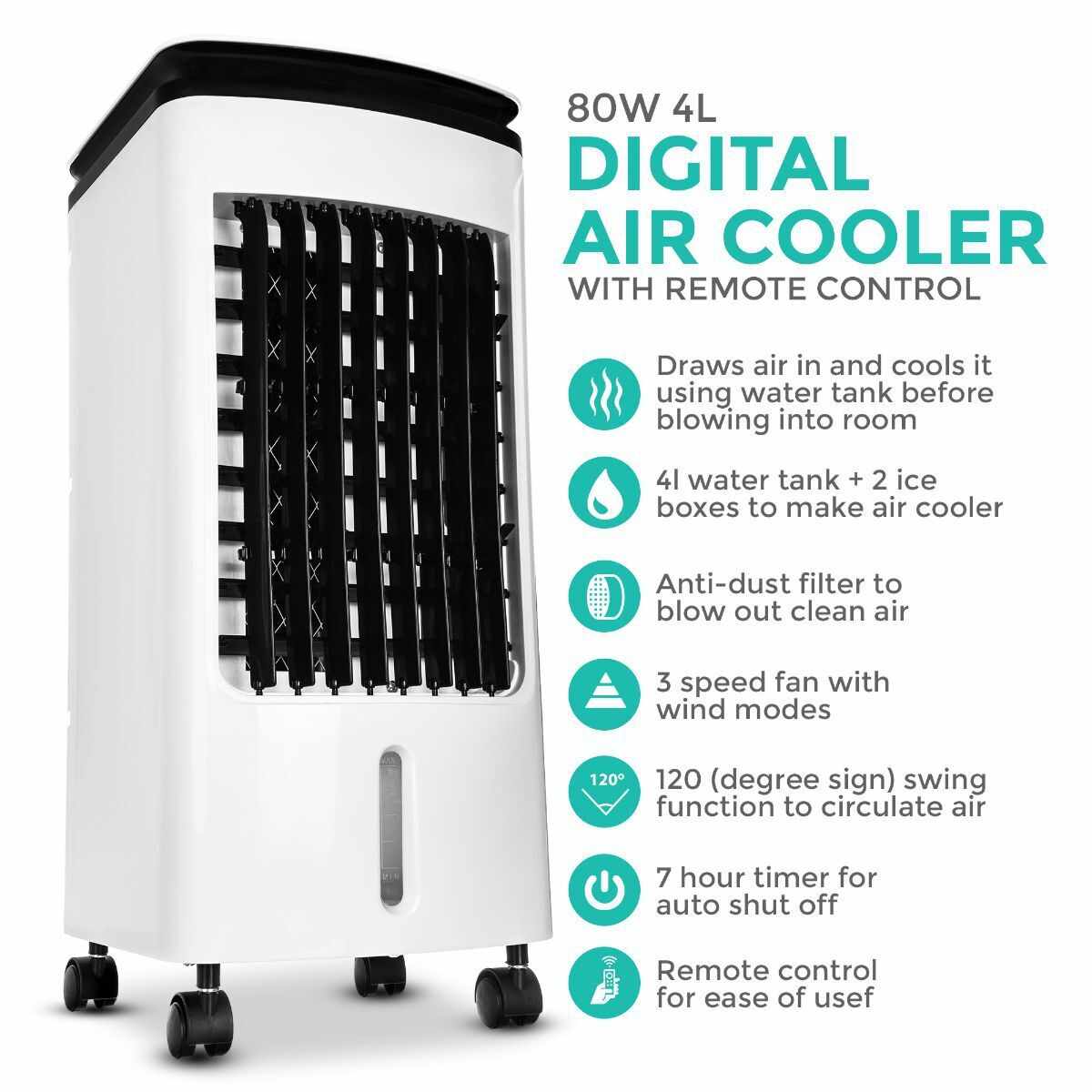 To stay cool and comfortable in warm weather, use the 80W Digital Evaporative Air Cooler. To deliver chilly, moist, oxygen-rich air, this strong yet energy-efficient cooler uses evaporative cooling. This Air Conditioner includes several features that make it simple to operate and adjust, such as a digital control panel, an advanced cyclone fan, numerous speed and air pattern combinations, a dust filter, a sizable 4L reservoir, and a 120 degree oscillation function.