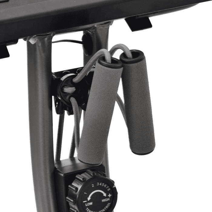 Our stationary bike comes with a working desk that allow to you place your laptop or tablet on it while you excise. This indoor cycling bike also comes with a resistance cables with 8 different weight for you workout your whole body! Thanks to the design of this upright exercise bike, your spine is in an ergonomically comfortable position while exercising.