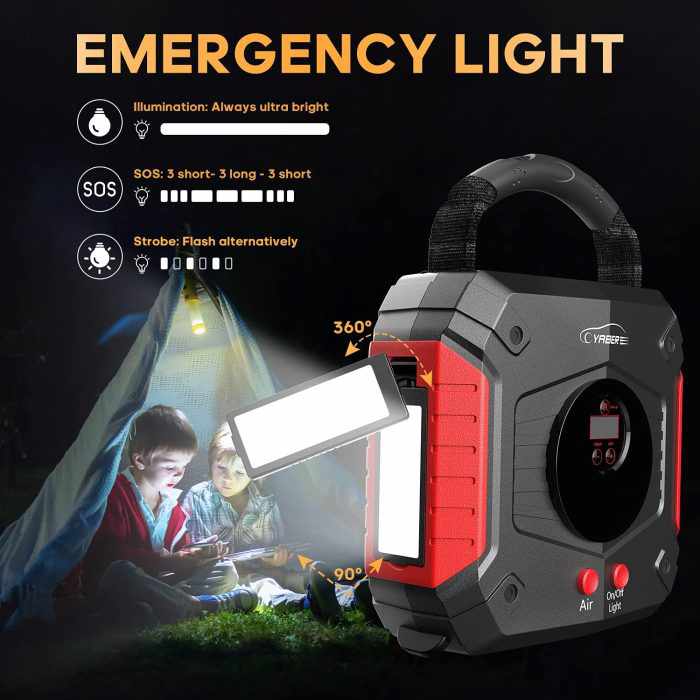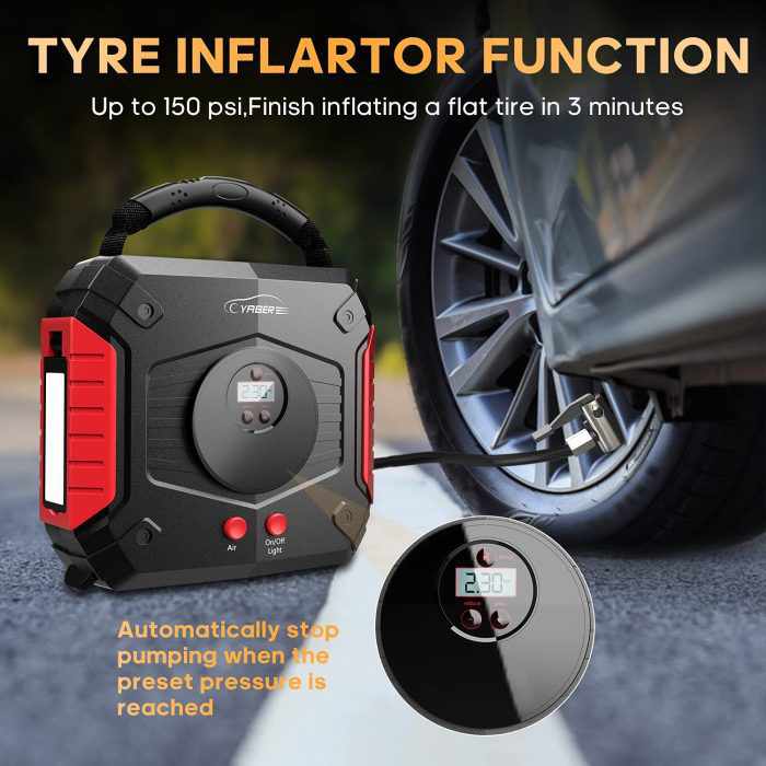 When linked to your tire, this car jump starter's integrated smart air compressor can display data on an LCD. It has a 45-minute operating time, a maximum airflow of 45L/Minute, a maximum pressure of 150 PSI, tire pressure detection, preset values stopping, and four unit switching options (PSI, Bar, Kpa, Kg/cm2). The YA30 jump starter can quickly inflate your bike, air bed, sports balls, etc. in just three minutes and comes with three adapter valves.