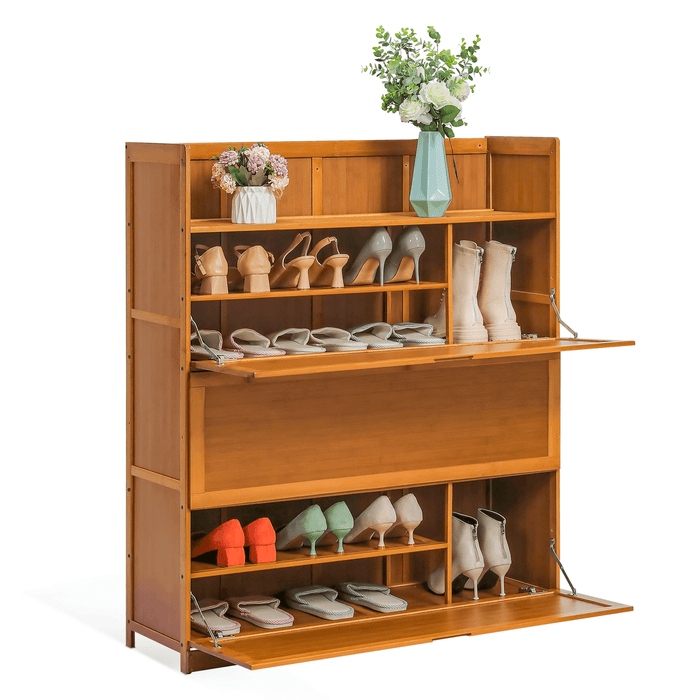 The drop-down door design of the shoe rack cabinet provides easy access to shoes and boots, while also keeping them out of sight. This can help to keep the space looking neat and tidy, and this slim shoe cabinet can provide more privacy when needed.